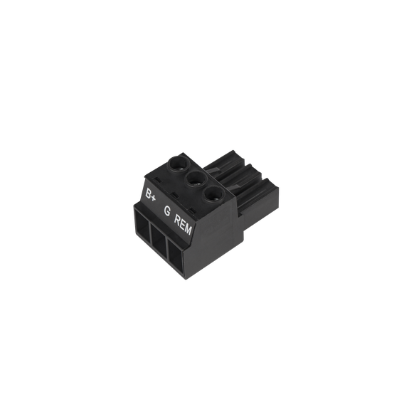 Detachable power plug with connections for Battery (B+), Ground (G), and Remote Turn-On (REM). Secures bare wire using screw and captive compression clamp. For use with select 2012 and newer compact PUNCH amplifiers.