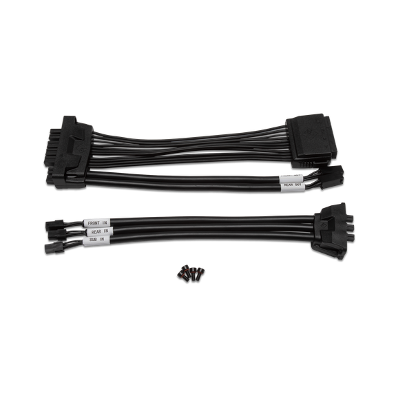 Signal input extension, speaker output extension, and power input extension harnesses to make remote connections on M5 amplifier. Provides only extension harnesses and mounting screws as pictured. Does NOT include actual power connector, RCA harness, or speaker harness.