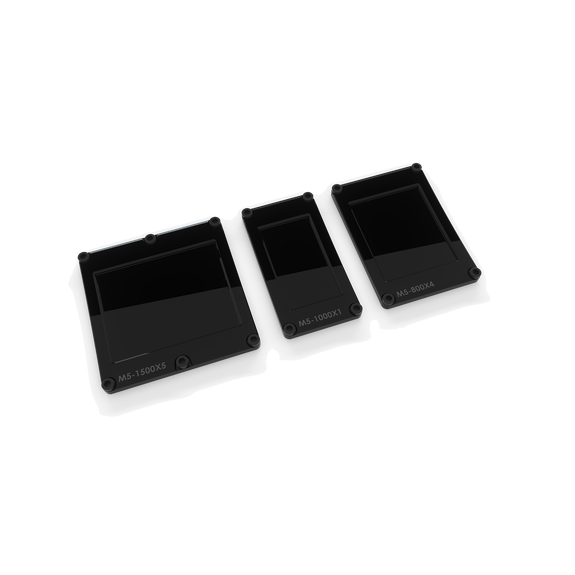 Replacement IPX6 covers for M5-800X4, M5-1000X1, M5-1500X5 amplifiers. Kit includes (1) M5-800X4 smoked cover, (1) M5-1000X1 smoked cover, and (1) M5-1500X5 smoked cover with mounting screws as shown in photo. Individual covers not sold separately.