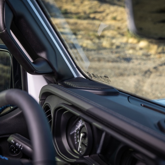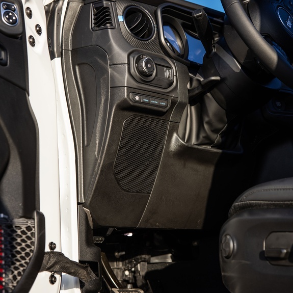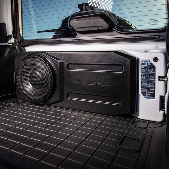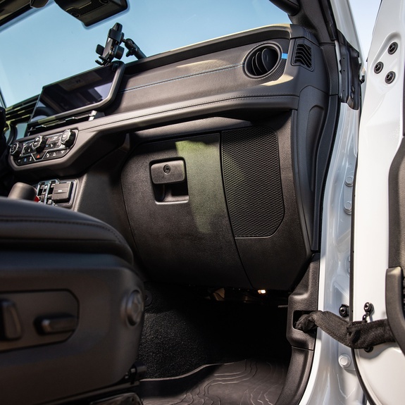 The Jeep Wrangler Stage 3 is an all-in-one 1,800 Watt high-performance audio system that’s 4x louder than the base audio and nearly 2x louder than the premium audio system. It stands apart from the competition with its fully integrated Digital Signal Processor tuned specifically for Jeep Wrangler by Rockford Fosgate engineers using a custom designed 6-microphone array. This system retains the existing overhead soundbar.