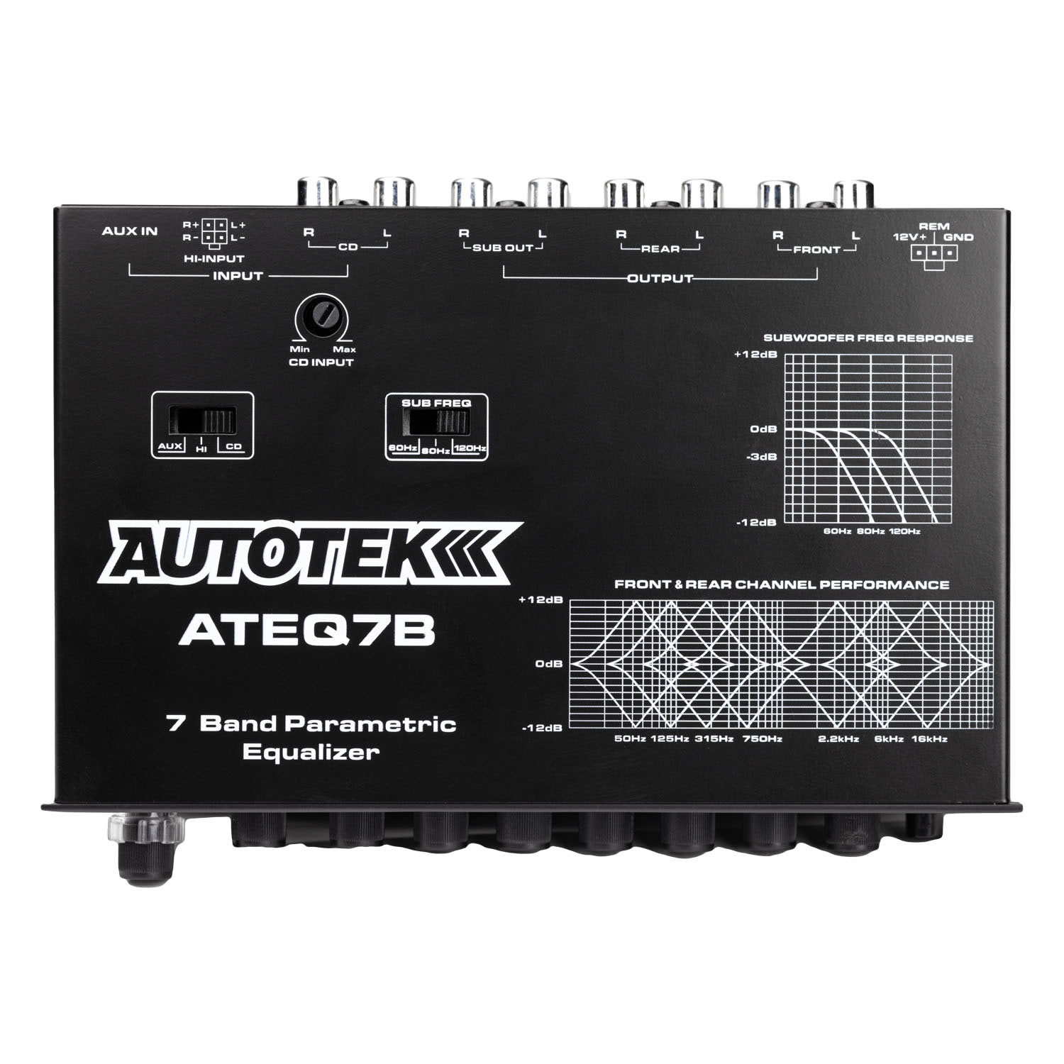 The Autotek ATEQ7B is a 7-band parametric equalizer with a built-in crossover and 9-volt line driver, designed to enhance and fine-tune your car audio system. It allows precise control over sound frequencies, subwoofer level, and overall audio output, making it ideal for multi-amplifier and high-performance sound setups.