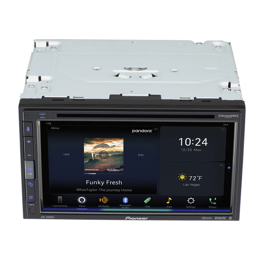 The Pioneer AVH‑2500NEX/B is a premium double‑DIN multimedia receiver featuring a 6.8″ resistive WVGA touchscreen display (800×480 resolution) that supports both wired Apple CarPlay® and wired Android Auto™ for seamless smartphone integration. It offers built‑in Bluetooth® for hands‑free calling and wireless music streaming, Amazon Alexa® integration via the Pioneer Vozsis® app, HD Radio™, and it is SiriusXM‑ready for satellite radio compatibility. For media playback, it supports CD/DVD read/write, USB mass‑storage playback (MP3, WMA, AAC, FLAC) and AUX/AV inputs. On the audio side, it includes six‑channel 4‑volt pre‑amp outputs (for front, rear, sub‑woofer), built‑in MOSFET amplification rated up to 50 W × 4 (peak), a 13‑band graphic EQ, high/low‑pass filters and support for dual camera inputs for auxiliary and backup camera visuals.