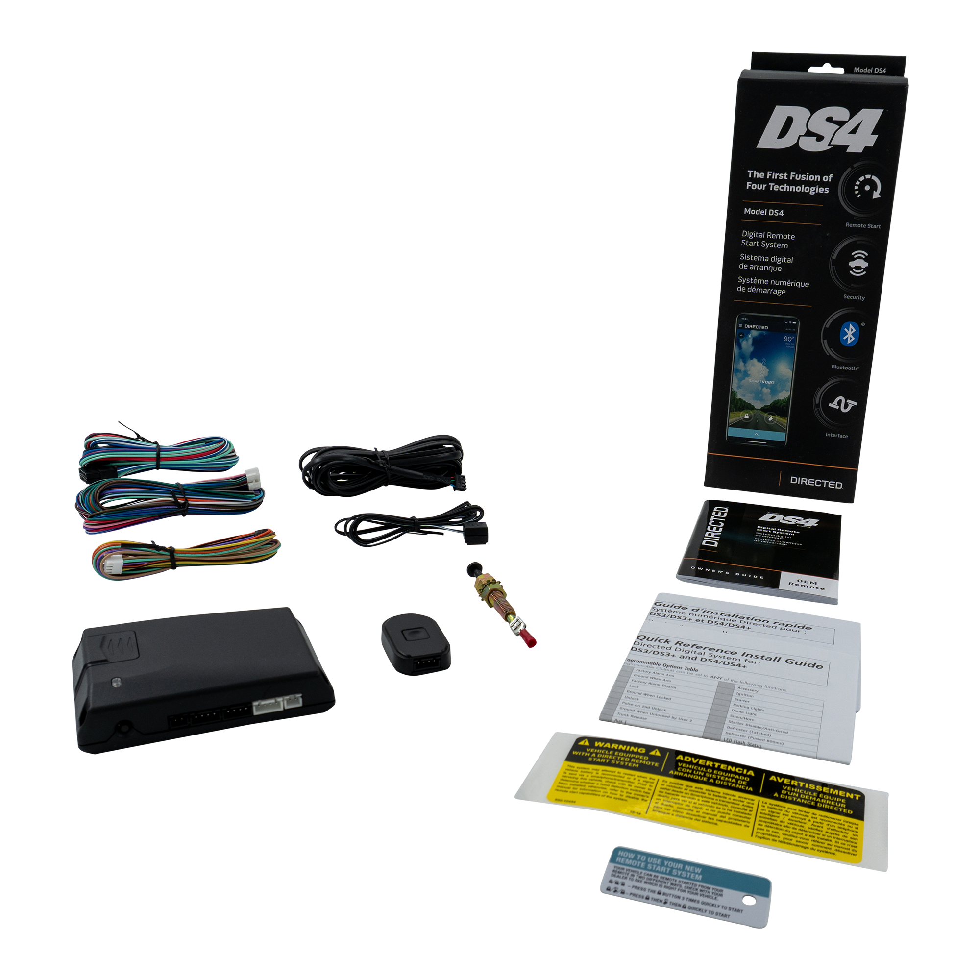 The DS4 is a digital remote start and security platform built for modern vehicles, combining Bluetooth® smartphone control with flexible long-range remote options. It features an integrated, programmable CAN interface for bypass and override, and it can be configured as Remote Start only, Security only, or Remote Start + Security (with additional hardware for security features).