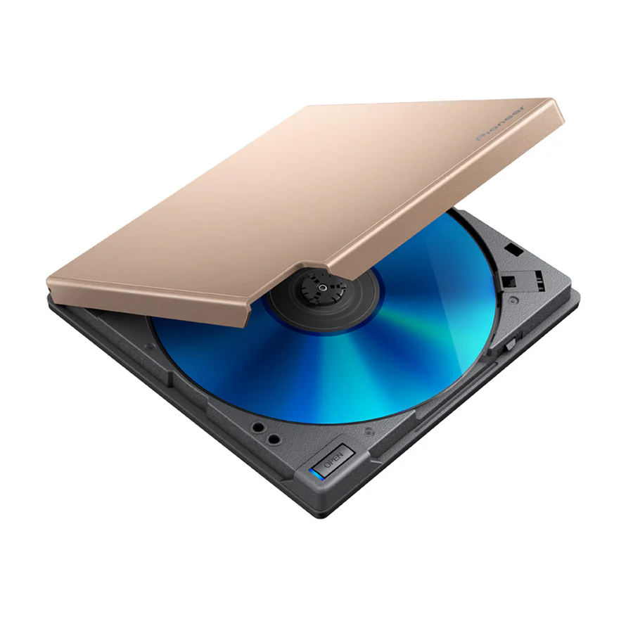 The Pioneer BDR‑XD08G is a slim, portable clamshell‑type external Blu‑ray, DVD and CD writer that connects via USB 3.2 Gen 1 (USB Type‑C/USB‑A) and supports large‑capacity formats including BDXL and M‑DISC archival media. It weighs about 230 g (0.51 lb) and features a compact footprint (~133 × 14.8 × 133 mm) making it well‑suited for mobile/desktop use. Key features include PureRead 3+ technology for improved audio‑CD ripping accuracy, Custom Eco power‑saving mode and a “Forced Open” lever for manual disc ejection.