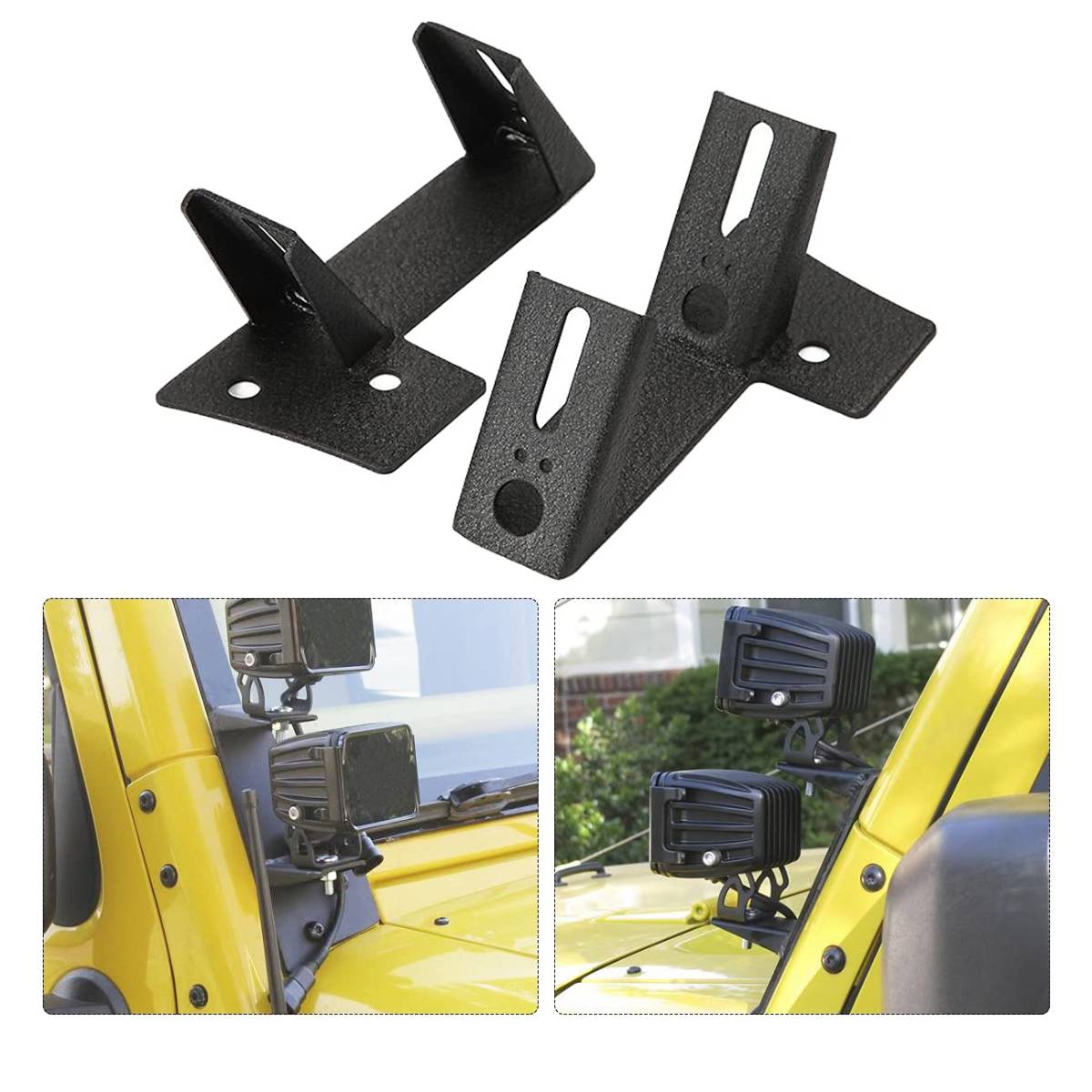 - Aftermarket windshield A-pillar mounting brackets for Jeep Wrangler JK/JKU 2007-2017.