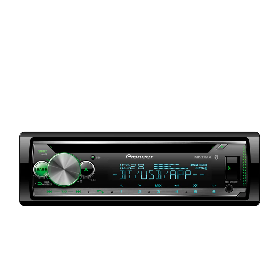 The Pioneer DEH‑S5200BT/B is a high‑performance single‑DIN digital media receiver that combines CD playback, built‑in Bluetooth® for hands‑free calling and wireless audio streaming, a front USB port (with support for MP3, WMA, AAC, WAV, FLAC), and a detachable one‑touch panel with multi‑colour illumination. It features a built‑in MOSFET amplifier rated at 50 W × 4 channels, three pairs of 2‑volt RCA pre‑outs (front/rear/sub) for system expansion, a 13‑band graphic EQ (which can extend to 31‑bands via the Pioneer Smart Sync™ app), and support for the Smart Sync app for iOS/Android control and voice‑command access.