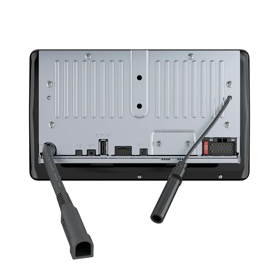 The floating display configuration allows a large display to be installed using a universal 2-DIN chassis. The floating screen offers horizontal, vertical, and tilt adjustability to ensure the best fit and usability in the vehicle’s dash.