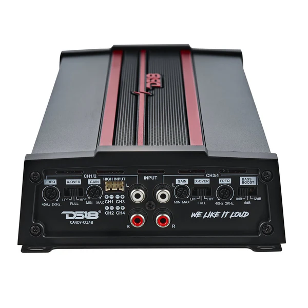 The CANDY‑XXL4B is a high‑output 4‑channel Class D car audio amplifier from the DS18 Candy Series, built to deliver powerful, clean sound across multiple speakers in your vehicle. This robust amp is ideal for driving front and rear door speakers or powering a full‑range audio system with clarity and increased volume. With features like adjustable gain, high‑pass and low‑pass crossover controls, bass boost, and remote level options, the CANDY‑XXL4B lets you fine‑tune your system for balanced sound staging and better overall performance. Engineered with efficient Class D technology, it runs cool, stays small in size, and offers reliable power delivery for cars, trucks, UTVs, and other 12 V audio systems.