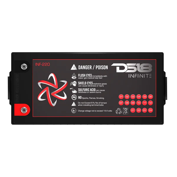 The DS18 INF-220AH is a high-capacity 12 V AGM Power Cell battery engineered to deliver robust and reliable electrical power for demanding car audio systems, electronics, and heavy-duty automotive applications. With an impressive 220 Ah capacity and a 6500 W power rating, this maintenance-free Absorbed Glass Mat (AGM) battery provides stable voltage delivery and high burst current for powerful performance under heavy loads. Its non-spill sealed design allows flexible mounting in various orientations — including upside down — while thread lead alloy recessed M8 bolt terminals ensure secure connections and easy integration with add-on busbars or terminals. Built to handle intense power demands and maintain consistent voltage for extended periods, the INF-220AH is ideal for high-wattage audio systems, accessories, and custom electrical setups.