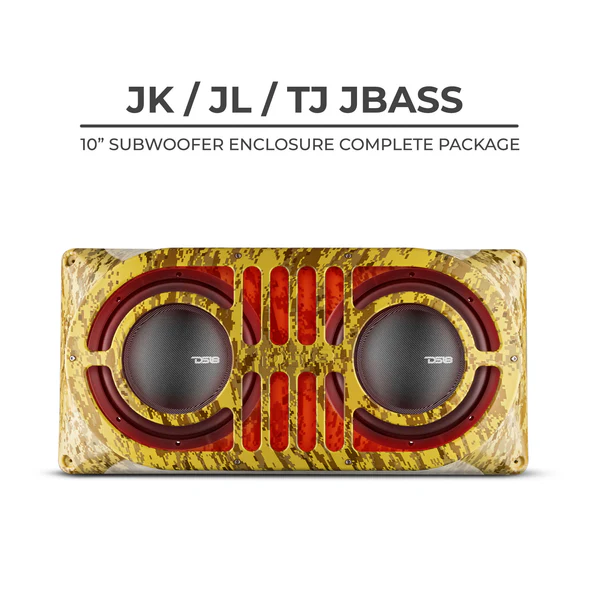 The heart of this package lies in the robust and highly durable plastic mold-injected subwoofer enclosure. This Tan Camo version of our renowned JBASS Enclosure is specifically designed to fit the back of all TJ, JK, or JL Jeeps. This ported enclosure effortlessly accommodates two DS18 shallow mount subwoofers.