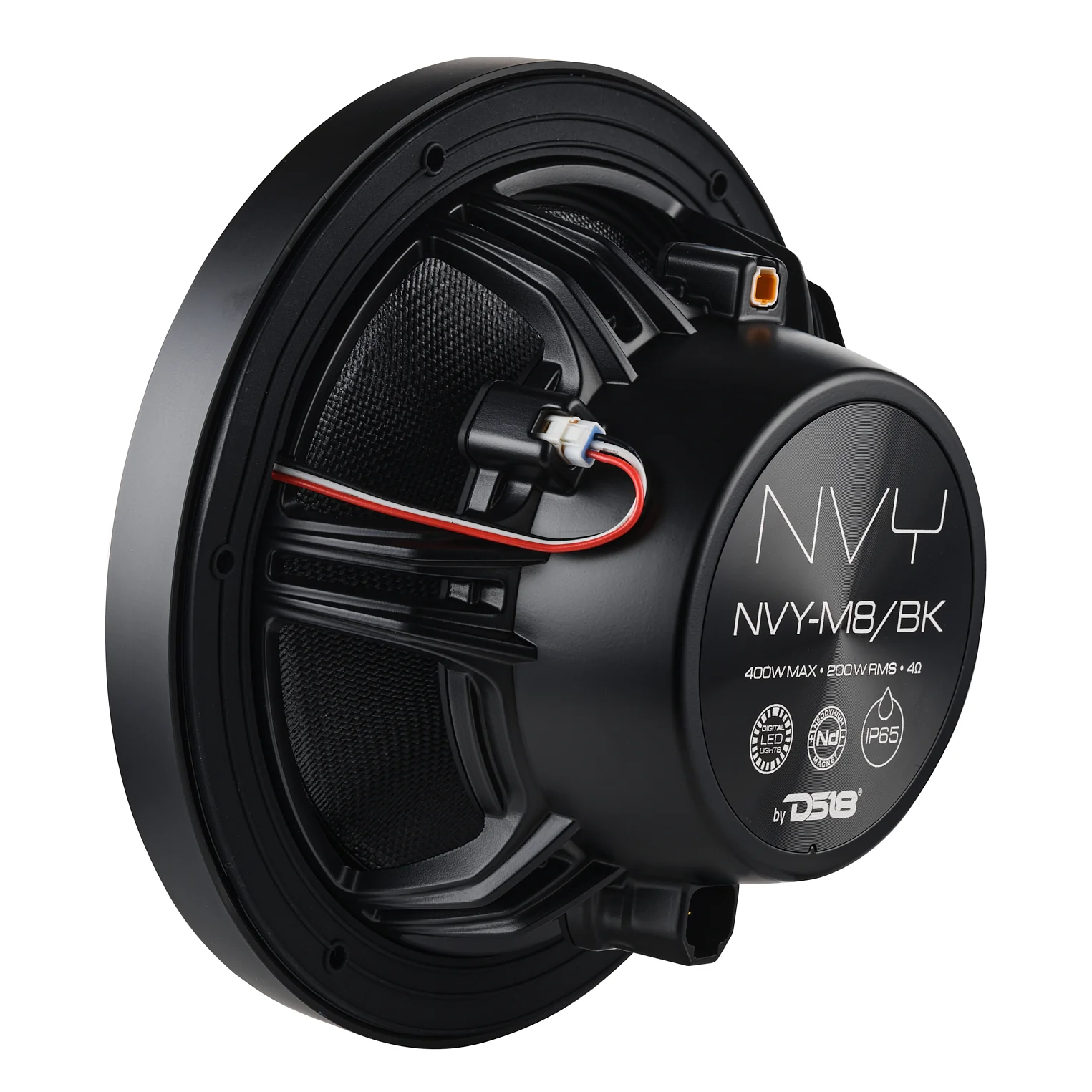 The NVY-M8 is an 8-inch high-performance marine coaxial speaker designed for powerful, clear, and immersive audio in marine and outdoor environments. Featuring a Kevlar cone woofer, floating bullet tweeter, and a high-efficiency neodymium magnet, this speaker delivers strong mid-bass, detailed mids, and crisp high frequencies. Built with marine-grade materials and IP65 water resistance, the NVY-M8 can withstand harsh conditions on boats, ATVs, motorcycles, and other powersports vehicles. It also includes integrated digital RGB LED lighting, adding a visually striking effect while maintaining excellent audio performance.