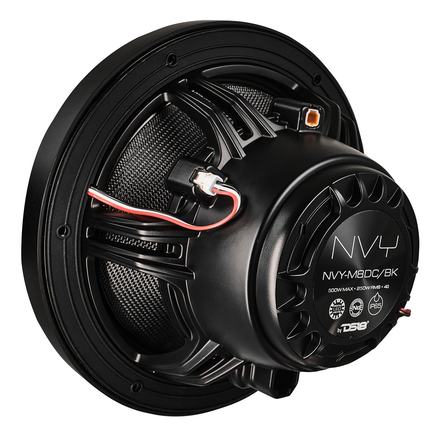 The NVY‑M8DC is an 8″ marine‑grade hybrid coaxial speaker pair featuring a Kevlar‑reinforced cone, horn‑loaded compression driver, and integrated digital LED lighting. Designed for marine, powersports, UTV, ATV, and custom outdoor audio systems, it delivers powerful, detailed sound with clear highs and strong midbass response. Built with IP65 waterproof and UV‑stable construction, these rugged speakers are ideal for harsh environments and immersive outdoor audio installations.