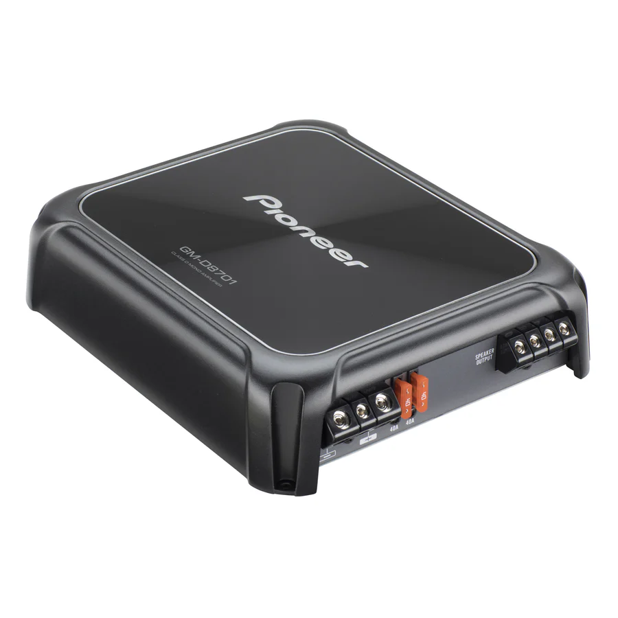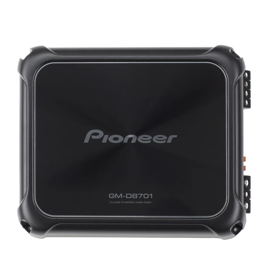 The Pioneer GM-D8701/B is a Class-D monoblock car amplifier designed to deliver high-quality audio performance in automotive sound systems. It offers 300W RMS at 4 ohms, 500W RMS at 2 ohms, and 800W RMS at 1 ohm, with a maximum power output of 1600W. The amplifier features a frequency response range of 10 Hz to 240 Hz, ensuring accurate and detailed sound reproduction. Its Class-D design provides high efficiency with minimal heat generation, allowing for a compact chassis. The GM-D8701/B includes a wired bass boost remote for optimal bass level adjustment according to listening preferences and music characteristics.