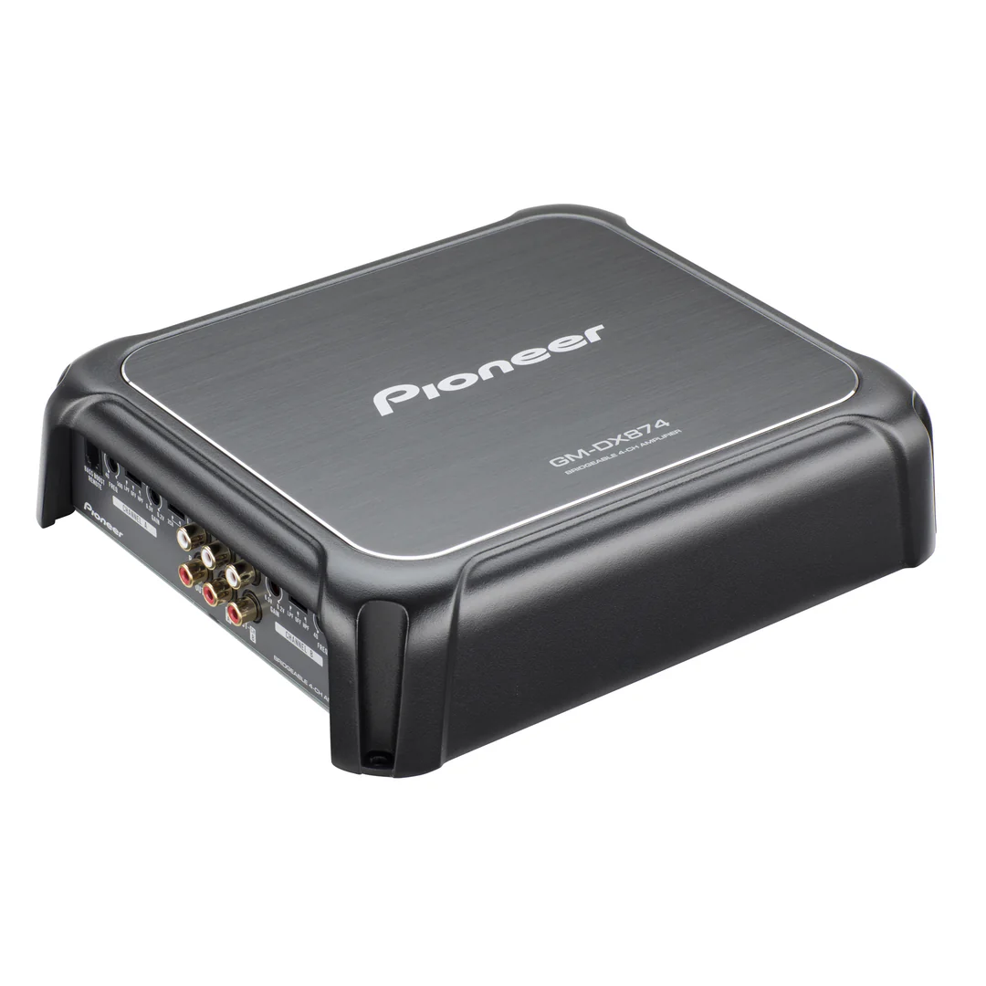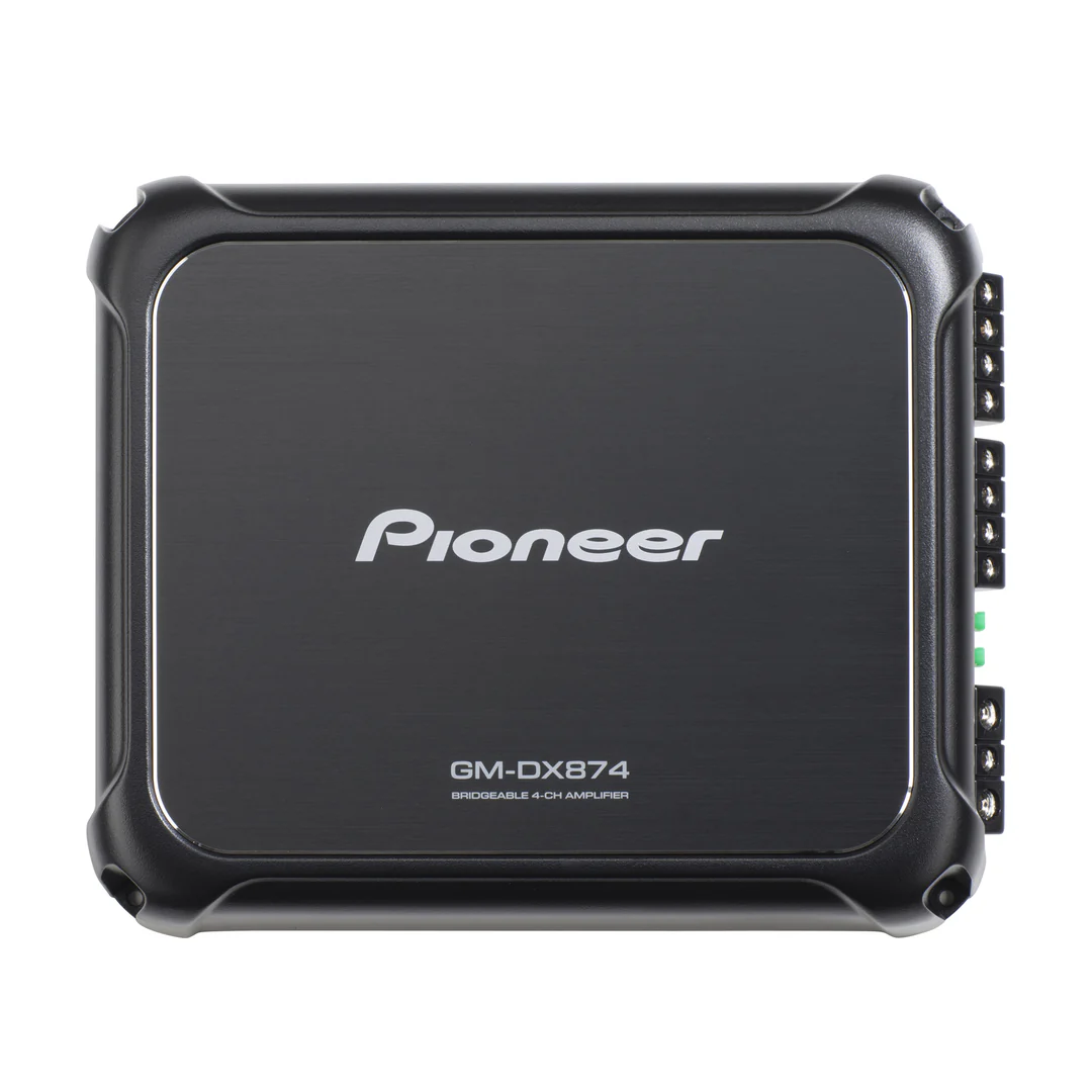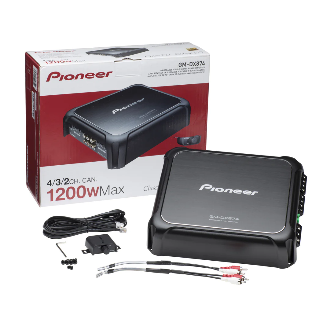 The Pioneer GM-DX874 is a compact 4-channel Class D amplifier designed to deliver high-quality audio performance in automotive sound systems. With a maximum power output of 1,200 watts, it offers 100 watts RMS per channel at 4 ohms, 150 watts RMS per channel at 2 ohms, and 300 watts RMS per channel when bridged at 4 ohms. The amplifier features a frequency response range of 10 Hz to 50 kHz, ensuring accurate and detailed sound reproduction. Its Class D design provides high efficiency, minimizing heat generation and allowing for a compact chassis that fits in various installation spaces. The GM-DX874 is Hi-Res Audio certified, supporting high-resolution audio playback for an enhanced listening experience.