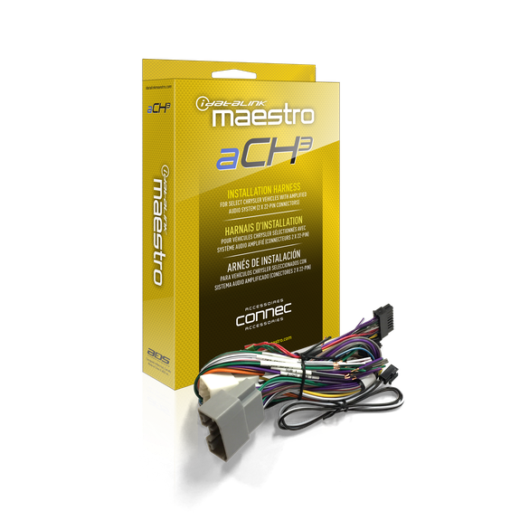 The HRN-AR-CH3 is a vehicle-specific T-harness designed by iDatalink Maestro for select Chrysler, Dodge, Jeep, and Fiat vehicles from 2012 to 2017 equipped with factory amplifiers, including Harman Kardon systems. This harness is essential for integrating the Maestro AR amplifier replacement module, allowing you to upgrade the factory amplifier to a powerful aftermarket amplifier without cutting or splicing factory wiring.