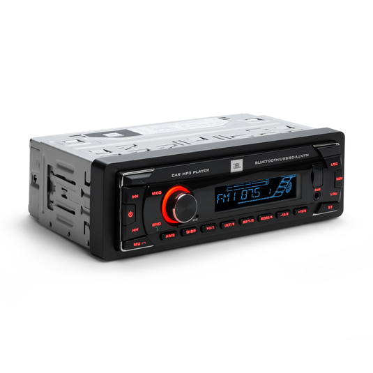 The JBL Celebrity 100 is a Single‑DIN multimedia car head unit designed to upgrade in‑car entertainment with versatile playback options and modern wireless connectivity. It features a detachable front faceplate for anti‑theft protection and supports Bluetooth streaming for music and hands‑free calling. Other playback options include USB, SD card, AUX inputs, and built‑in FM radio with 18 preset stations, making it a flexible choice for daily driving. With a maximum 4 × 50 W peak output and an included ISO wiring harness for easy installation, the Celebrity 100 pairs well with JBL entry‑level speakers and replaces a factory stereo conveniently.