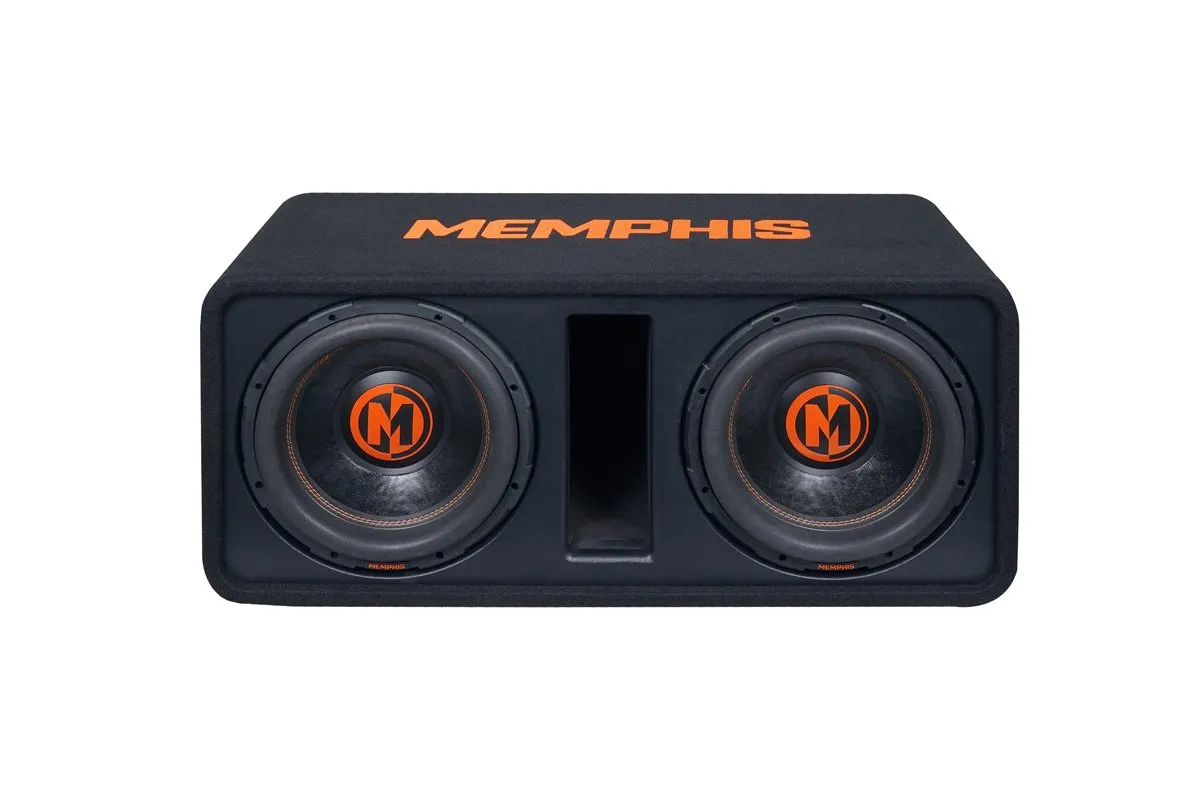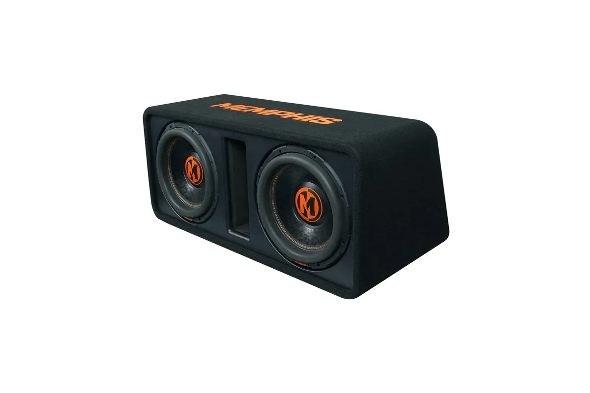 The MJPE12D1 is a dual 12″ loaded subwoofer enclosure from Memphis Audio’s MOJO Pro series. It features a 100% MDF enclosure with a front-loading port, high-current nickel-plated compression terminals, a custom-stitched carpet finish, black polypropylene dust caps, woven tinsel leads, and a high-temperature BASV voice coil former. The enclosure is tuned to 34 Hz for deep, powerful bass response.