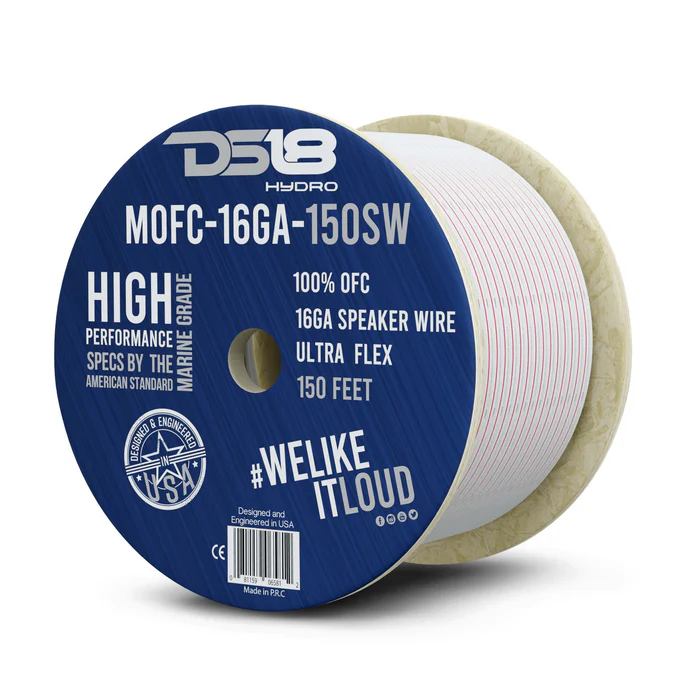 The DS18 MOFC16GA150SW is a high-performance speaker wire designed for marine and outdoor audio systems. It features 16-gauge (16 GA) ultra-flexible tinned oxygen-free copper (OFC) construction, ensuring superior conductivity and resistance to corrosion. The 150-foot length provides ample wire for various installation configurations, making it ideal for high-quality audio setups in harsh environments.