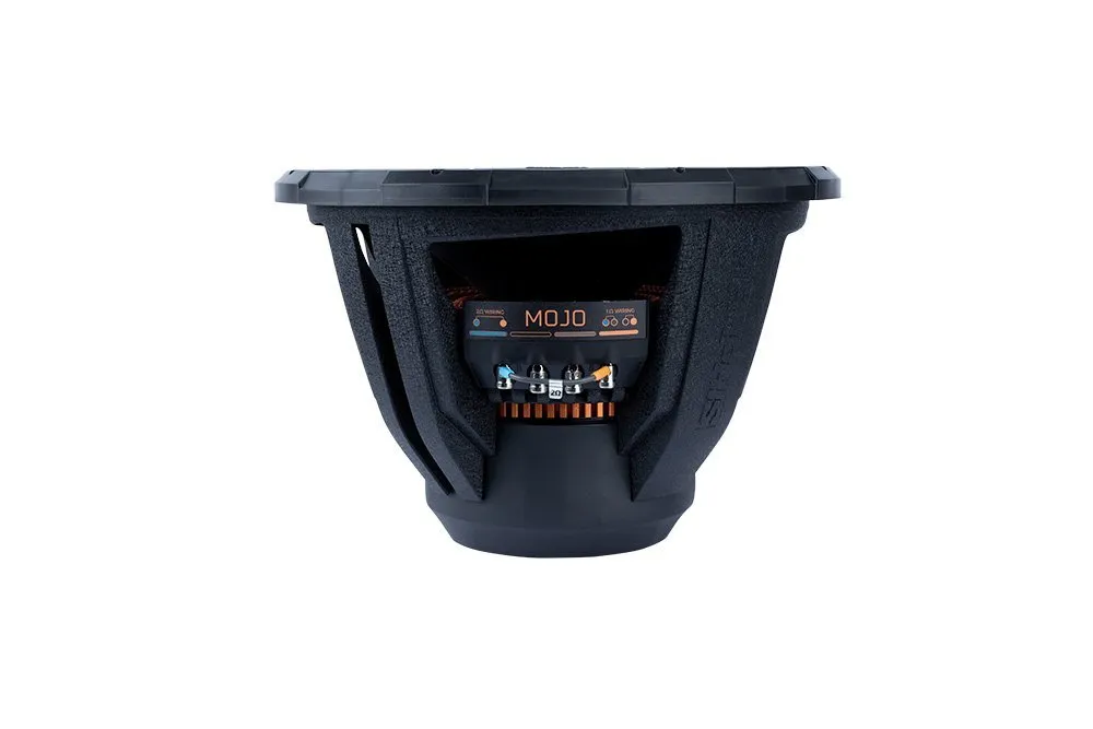 The MOJO1512 is a 15‑inch “MOJO 7 Series” component subwoofer designed to deliver extremely deep and powerful bass. It supports selectable impedance (1 Ω or 2 Ω) using FLEX™ technology, letting you match it more easily to different amplifiers. It features a lightweight polypropylene cone, a double-stitched folded rubber surround for high excursion, a vented cast‑aluminum basket for structural strength, and a 3.5″ triple‑aluminum voice coil with a reinforced spider. The sub is engineered for extreme power and efficiency with direct-vent voice-coil cooling (DVVC) to manage heat under heavy load.