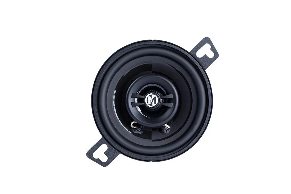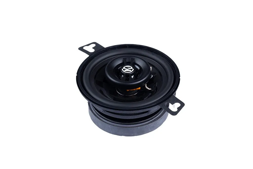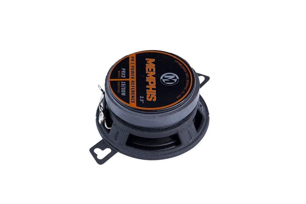 The PRX3 is a compact 3.5″ (3‑1/2″) 2-way coaxial speaker from Memphis’s Power Reference (PRX) series, designed for tight factory locations without sacrificing sound quality. It features a graphite-reinforced polypropylene woofer with a polyurethane surround for warm, punchy mids, paired with a ½″ PEI (Polyetherimide) dome tweeter mounted on a multi-direction pivot system that helps improve sound imaging. The speaker handles 15 W RMS (30 W peak), has a sensitivity of 87 dB, and uses a 4 Ω impedance. Its shallow mounting depth (~1.5″) makes it suitable for small OEM speaker slots.
