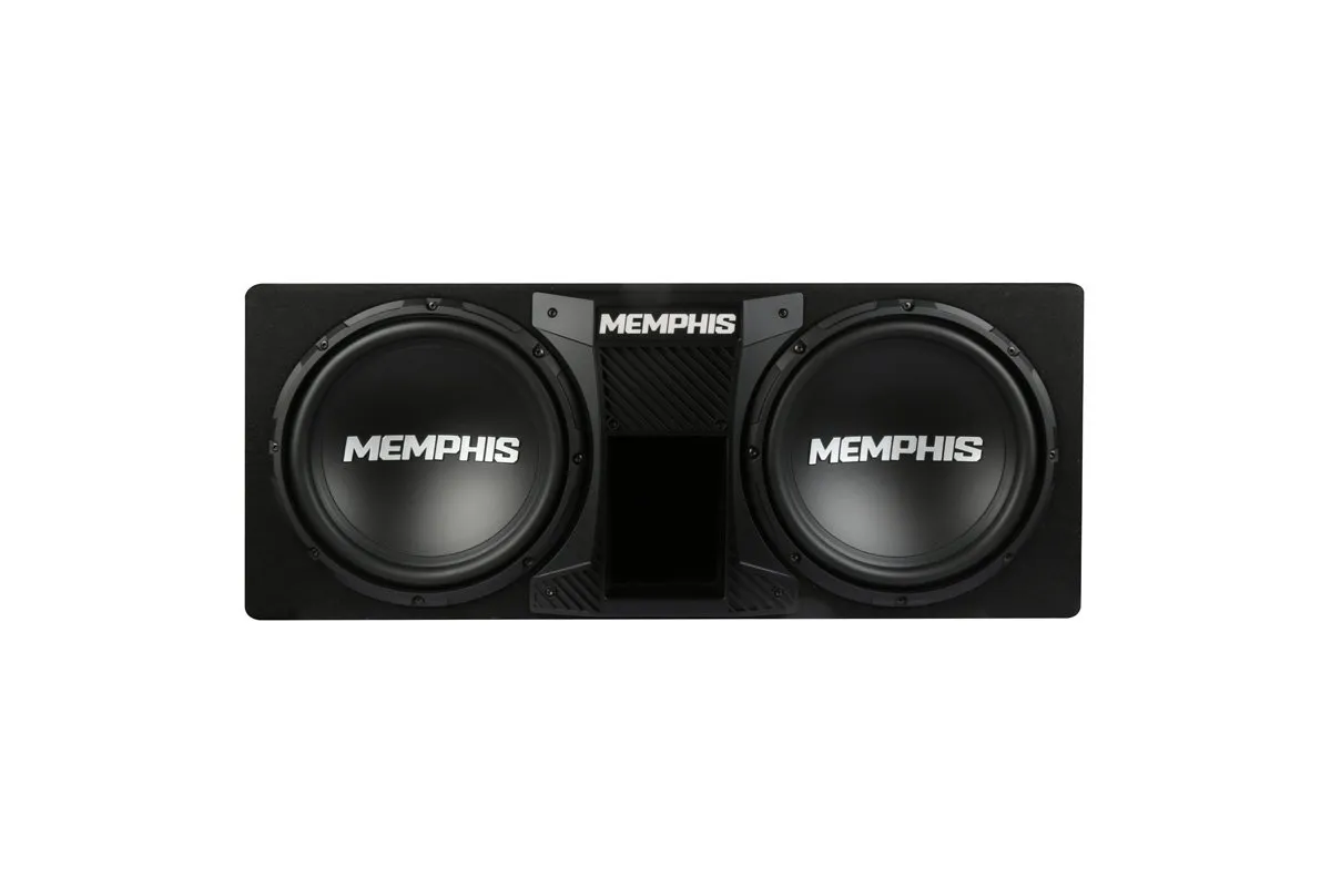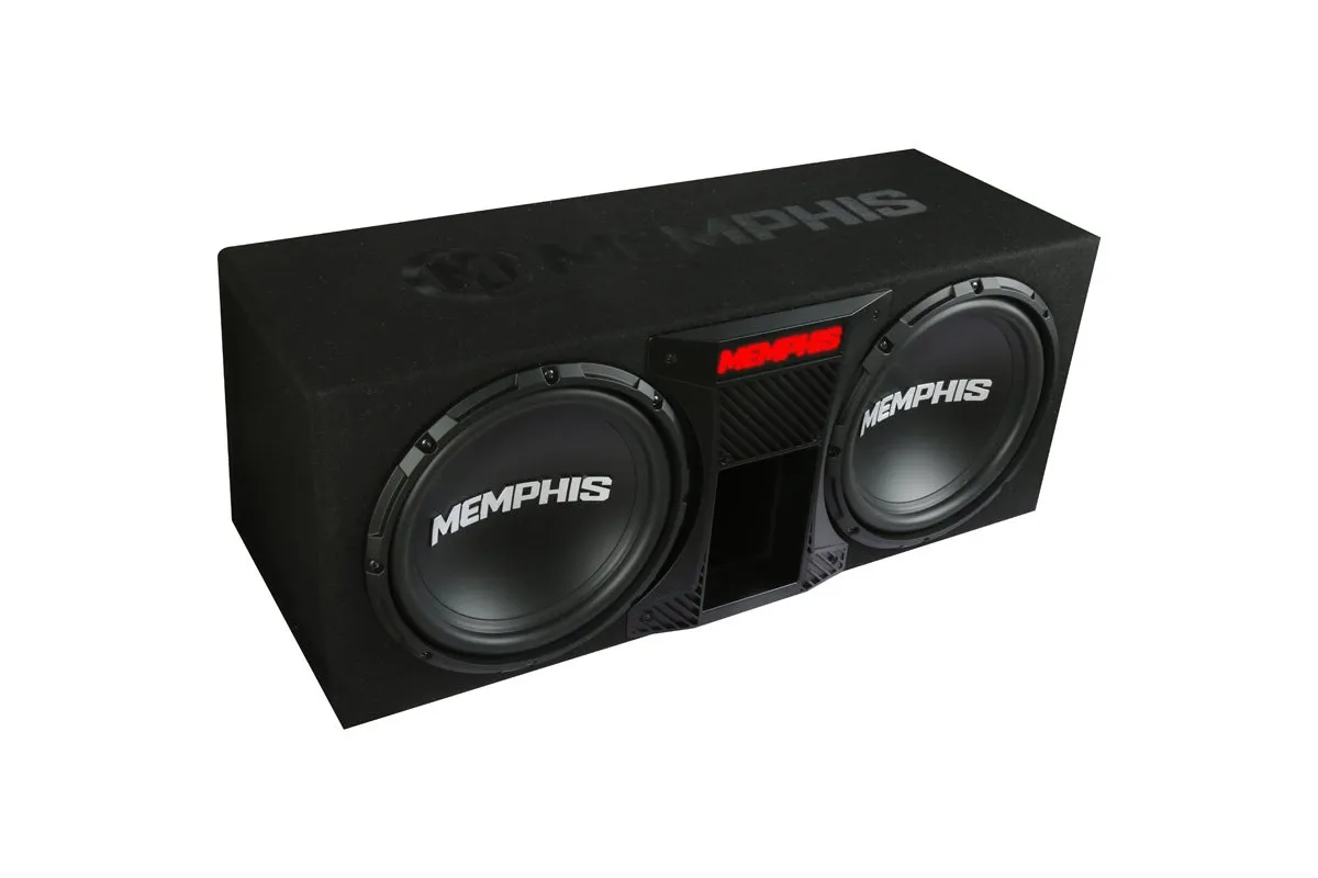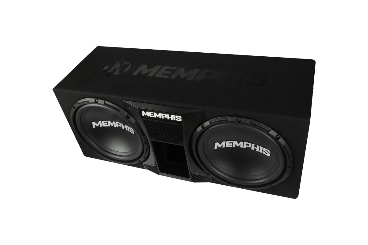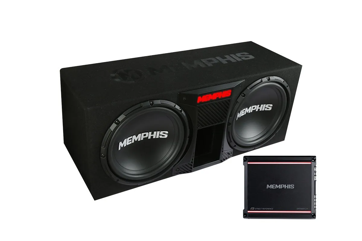 The SRXE12DP is a dual 12″ ported subwoofer package from Memphis Audio’s Street Reference (SR) line. It includes the SRX600.1V mono amplifier, integrated RGB LED lighting on the front panel, front-vented port design, variable low-pass filter (50–200 Hz), bass boost (0–12 dB), RCA and high-level inputs, remote bass knob, and a 0–180° phase switch.
