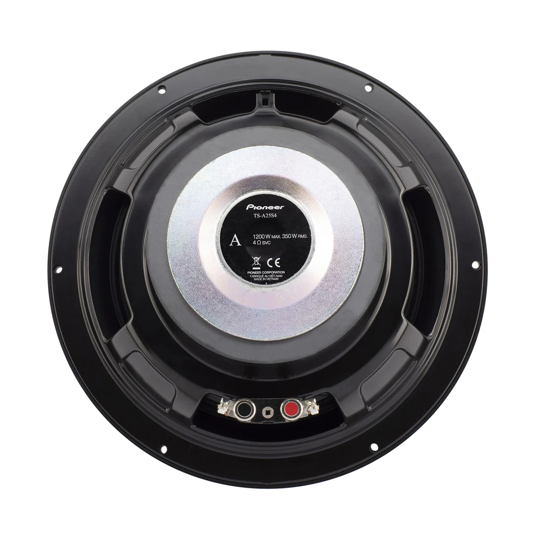 The Pioneer TS-A25S4 is a 10-inch A-Series subwoofer engineered to deliver deep, impactful bass in a compact design. With a peak power handling of 1200 watts and an RMS of 350 watts, it offers robust performance suitable for various audio setups. The subwoofer features an IMPP™ cone, combining interlaced mica and carbon composite materials for enhanced rigidity and reduced distortion. Its rubber surround ensures durability and consistent performance over time. Designed for versatility, the TS-A25S4 is compatible with both vented and sealed enclosures, making it a flexible choice for car audio enthusiasts seeking quality sound reproduction.