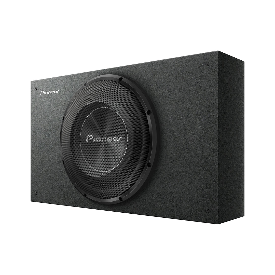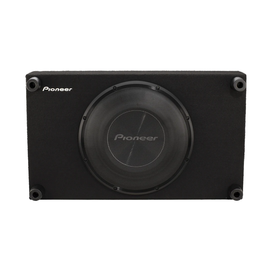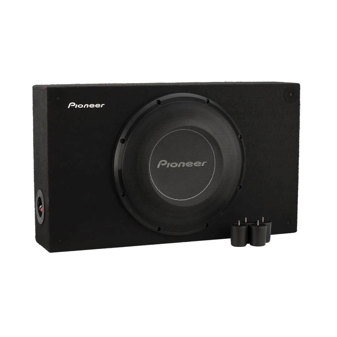 The Pioneer TS-A3000LB is a 12-inch shallow-mount pre-loaded subwoofer enclosure from the A-Series, designed to deliver powerful bass in compact spaces. With a 1500W peak power handling and a 400W RMS rating, it features a glass-fiber and mica reinforced IMPP™ cone, rubber surround, and aramid-fiber dual-spider design. The enclosure is sealed for tight, accurate bass response and is built with a 5/8″ medium-density fiberboard construction covered in black carpet. Its slim profile allows for versatile installation in various vehicles, including pickup trucks with standard or extended cabs.
