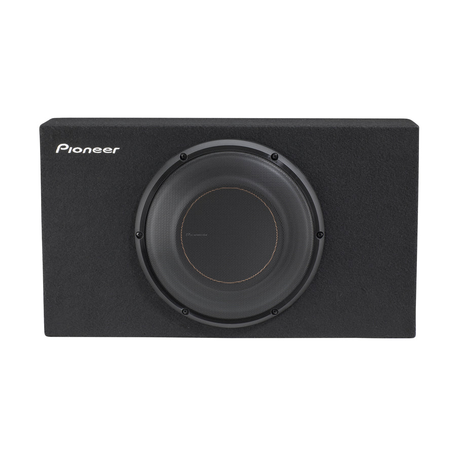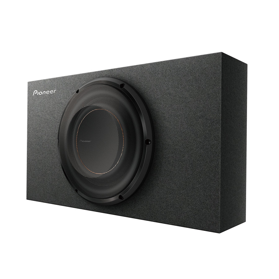 The Pioneer TS-D10LB is a 10-inch shallow-mount subwoofer from the D-Series, designed to deliver powerful bass in compact spaces. With a 350W RMS (1300W peak) rating, it features an aramid fiber reinforced polypropylene cone, butyl rubber surround, and a stamped steel basket. The subwoofer comes pre-loaded in a sealed enclosure, making it ideal for areas where a 10” subwoofer will not fit. Its compact design allows for installation in trucks and smaller cars, with the enclosure sized for spots as shallow as 6″ deep. The carpet covering and steel mesh grille help protect the subwoofer and give it a clean, finished look.