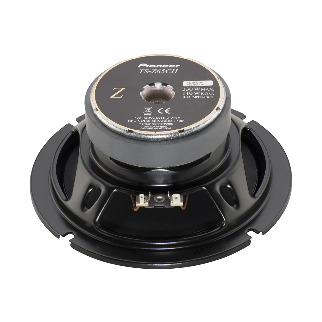The Pioneer TS‑Z65CH is a 6.5″ (≈ 16.5 cm) 2‑way component speaker system from the Z‑Series “audiophile” line, engineered for high‑resolution in‑car audio setups. It features a dual‑layer woofer cone made of Twaron® aramid fiber + cellulose fiber, paired with a 29 mm aluminum‑alloy balanced‑dome tweeter. The system supports 110 W RMS (nominal) power and up to 330 W peak power handling, with an impedance of 4 Ω, sensitivity rated at 85 dB (1 W/1 m), and a frequency response spanning approximately 30 Hz to 96 kHz.