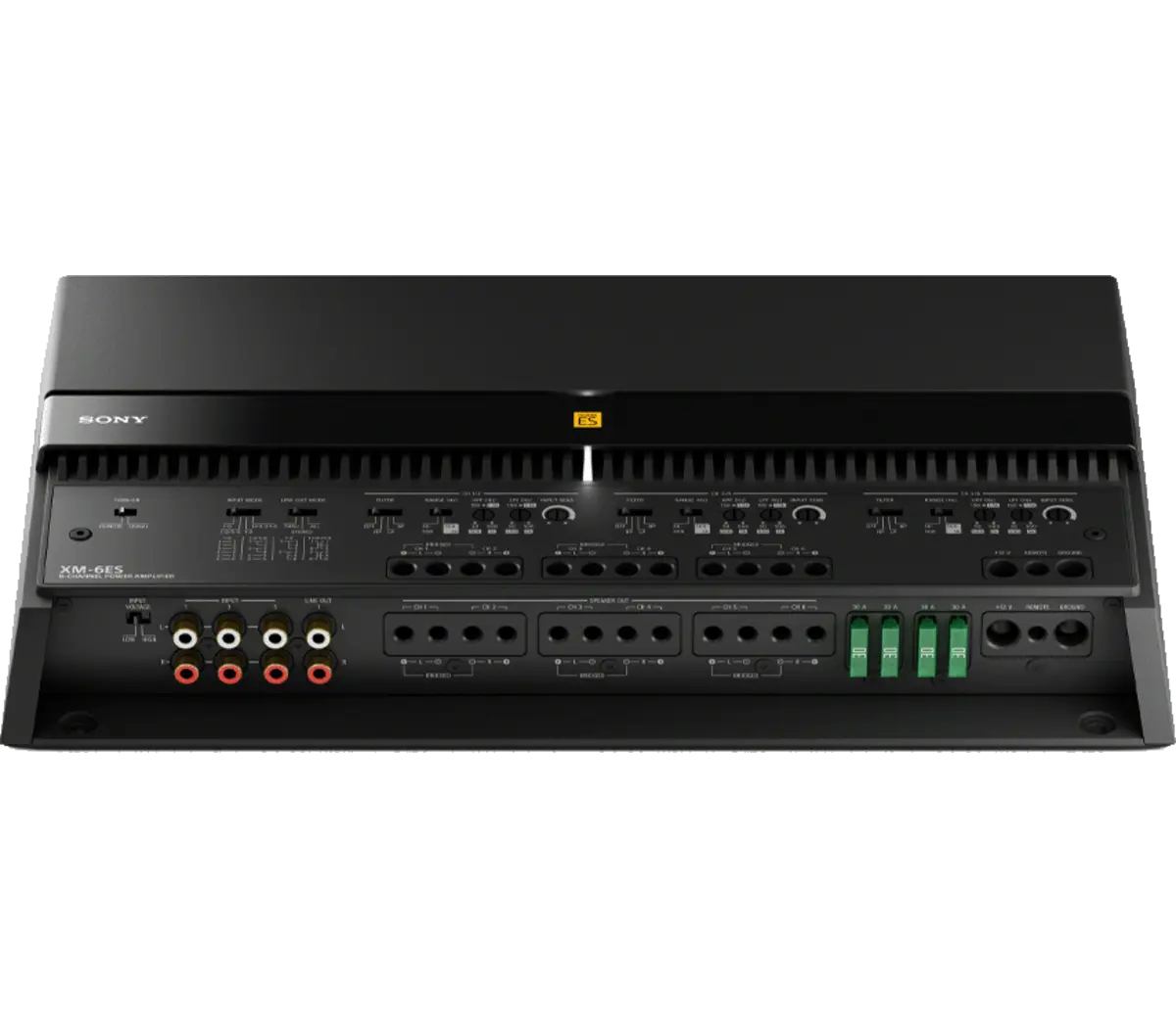 The Sony XM-6ES is a premium Mobile ES™ 6-channel Class D car audio amplifier engineered for high-resolution performance and flexible system integration. It delivers up to 100 W × 6 RMS at 4 Ω, 165 W × 6 RMS at 2 Ω, and 330 W × 3 bridged at 4 Ω, supporting a wide frequency response from 10 Hz to 40 kHz for ultra-detail audio. It features signal-summing for factory system integration, variable high- and low-pass filters, and gold-plated connections in a resonance-damped chassis.