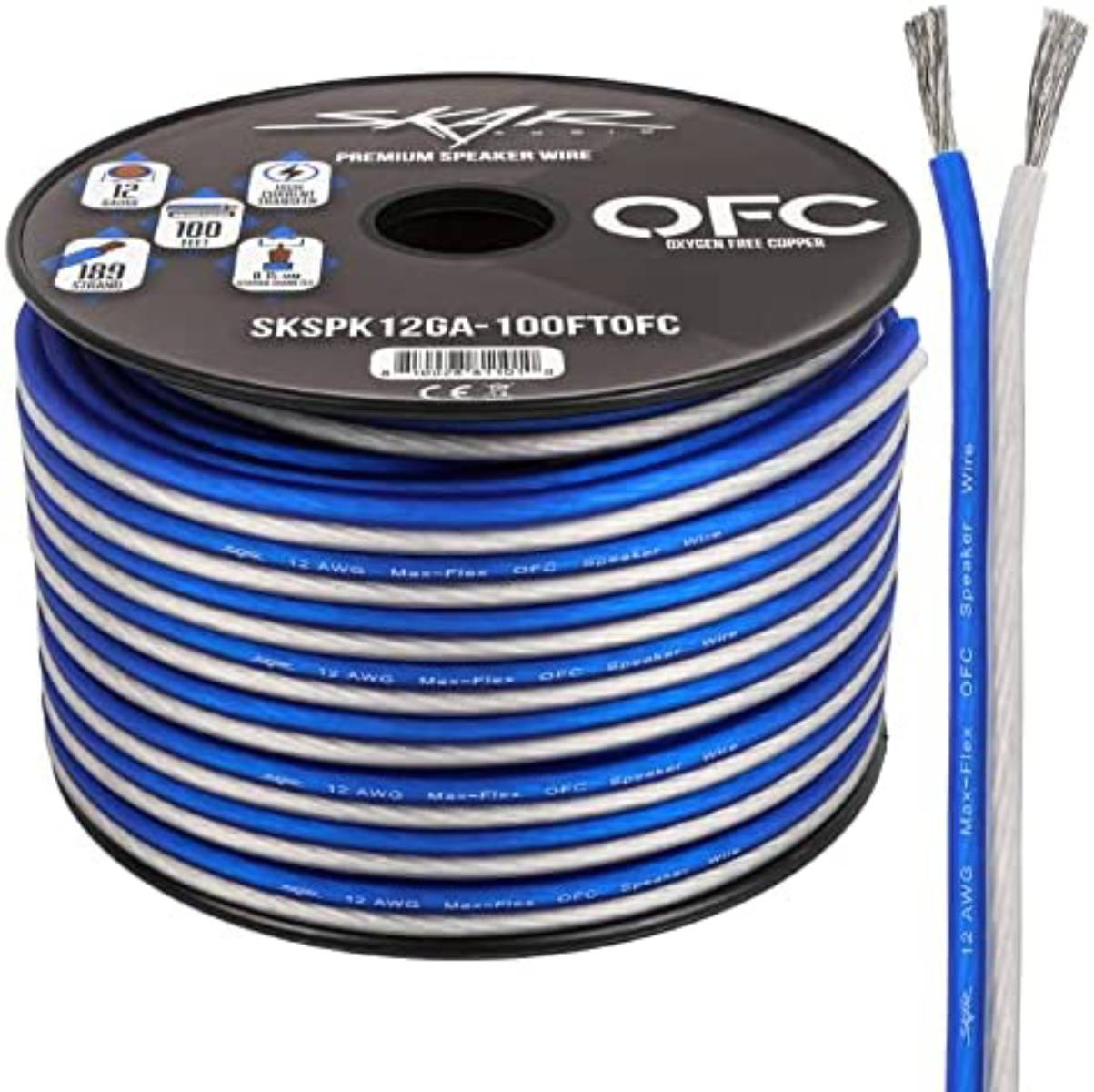 12 AWG OFC Speaker Cable, Clear Positive, Blue Negative, 100′ Spool